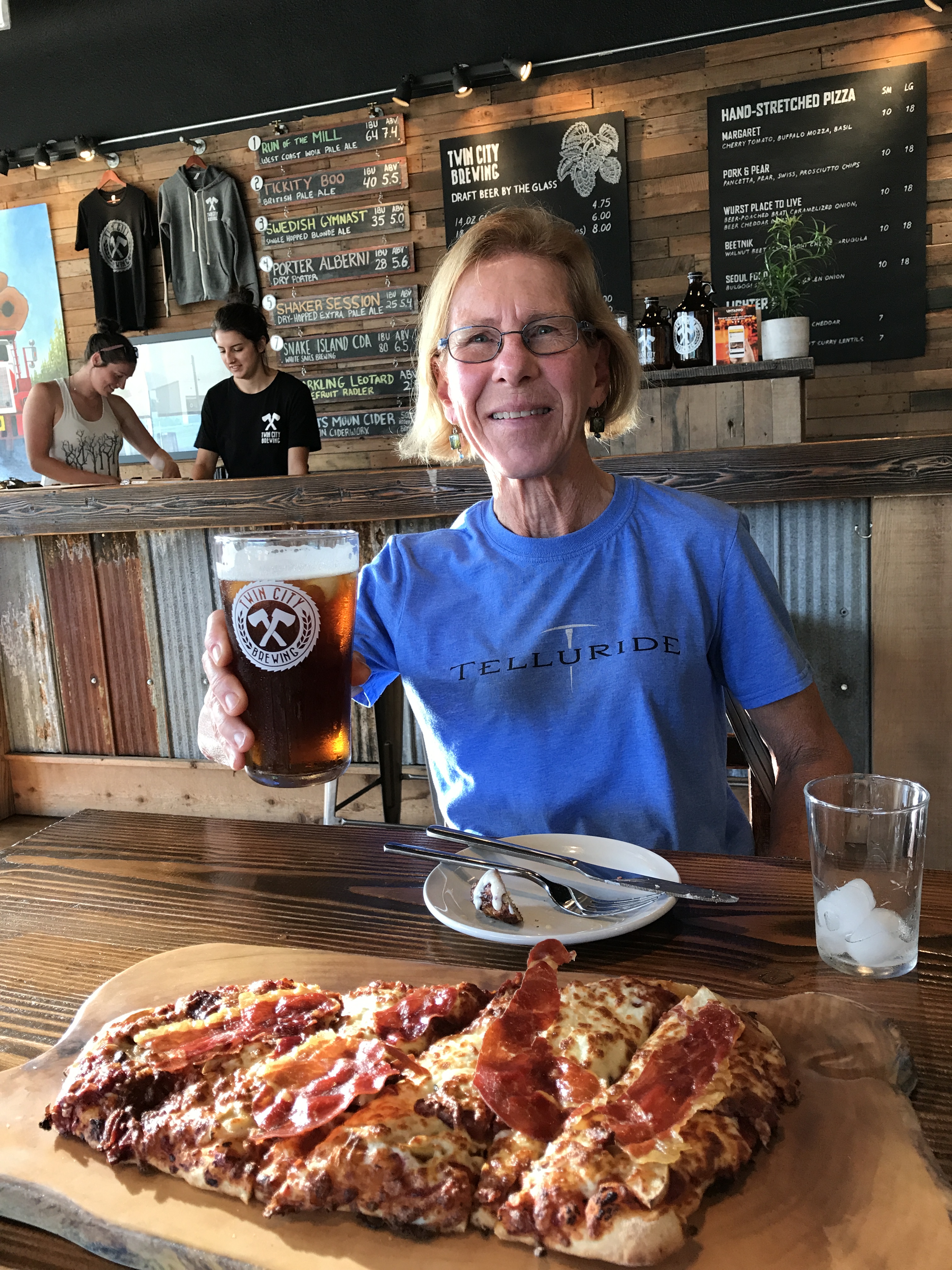 Mom throwing back a pint at Twin Cities Brewery
